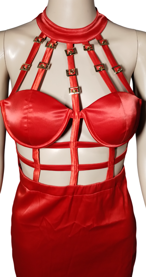 Lady Luxe Fashions This red satin dress features a striking top cutout that is adorned with elegant gold buckles. Crafted from luxurious satin fabric, this dress is sure to turn heads. With its unique design and premium materials, it offers both style and comfort for any formal occasion.